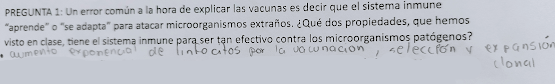 PREGUNTA: Un error común a la hora de explicar las vacunas es decir que el sistema inmune "aprende" o "se adapta" para atacar microorganismos extraños. ¿Qué dos propiedades, he hemos visto en clase, tiene el sistema inmune para ser tan efectivo contra los microorganismos patógenos?